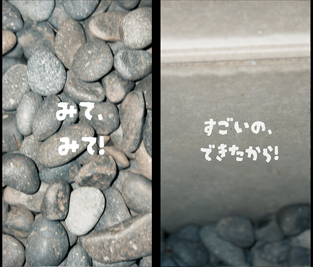 たくさんの動画をスクロールするなかで、突然子どものように「みて!」と呼びかけられたら、どれどれ見てやるかという気持ちになるでしょう。縦型なら、ただ石を積み上げただけでも迫力が出ると思いました。実際に石をたくさん積み上げたとき、承認欲求の矛先に私の妹が選ばれました。サプライズで見せると、良い反応が録音できたのでそのまま使いました。「どうやってつくったの?」「実はね、アロンアルフア。凄くない?」こんな会話を思い浮かべていただけたら嬉しいです。