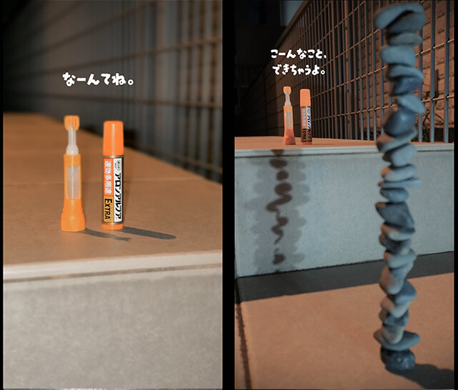 「瞬間接着剤」は、「瞬間愛着剤」です。 自分の手で直すたび、愛着が湧く。誰かを想ってつくるたび、愛着が増す。 趣味・推し・家族……いろんな愛をくっつける力があると考えました。 今回、「あの美女が加工を外すと?」というSNSあるあるの、過剰再現にチャレンジ。制作チームの膨大な試行回数の賜物です……! ライブ画面はリアルな質感、親子の本音はシネマティックな質感にして、バランスを編集で粘りました。お気に入りはラストの革靴デコ!