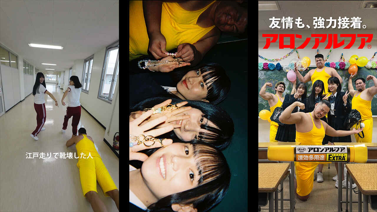 アロンアルフアを使ってみたいと思わせるべく、楽しい用途をたくさん見せることにしました。縦型媒体の文化に合わせ、よく見る女子高生の思い出ビデオの中に、アロンアルフアの擬人化である「イエローマッチョ」が紛れ込んでいるという企画です。本当に女子高生が制作した質感を追求し、撮影時の「ズッ友」感ある雰囲気づくりをはじめ、構図も敢えてつくり込まず演者本人に撮影してもらうなど工夫しました。編集もつくり込みすぎず、たくさんある思い出を詰め込んだハイテンポさを意識しました。
