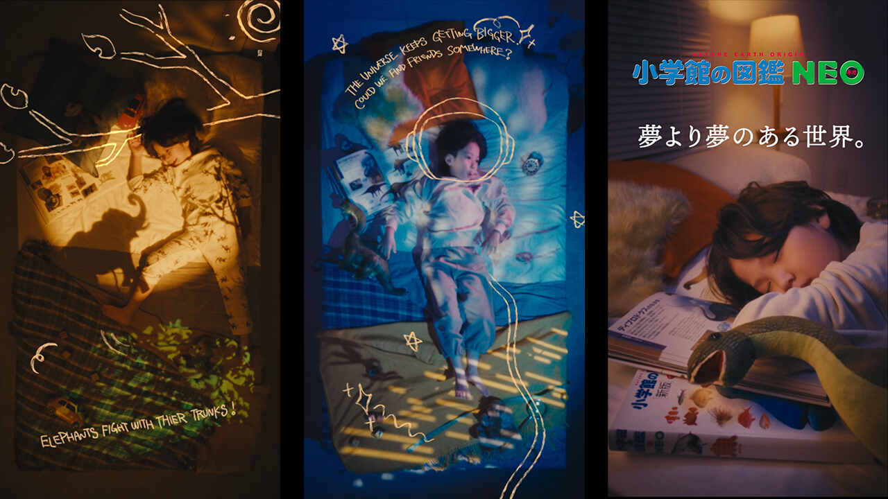 「図鑑は真実からつくられる商品。ウソをつかないことが大切」。オリエンの言葉から真実への真摯さこそ『小学館の図鑑NEO』の1番の価値と感じました。絵本で育つのが想像力なら『小学館の図鑑NEO』で育つのは世界への期待や希望です。悲しいニュースも多い今の時代に、この世界の素晴らしさをまっすぐ伝えられることは、唯一無二の一生物の贈り物だと感じ、子どもが親の愛情や『小学館の図鑑NEO』と出会い世界への期待をふくらませる姿を描きました。私たちも真実にこだわり本物の影絵や寝顔での演出に挑戦しています。