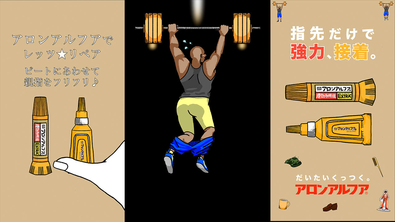 「大体のものはアロンアルフアで直せる」というテーマで制作しました。 スマートフォンという媒体の特性を生かしつつ、広告の中にインタラクティブ性を持たせることで視聴離脱を防ぐねらいで、リズムに合わせて親指を動かす「サムダンスチャレンジ」を採用しました。アロンアルフアの活用方法、瞬間・強力という機能を認知してもらえたら幸いです。