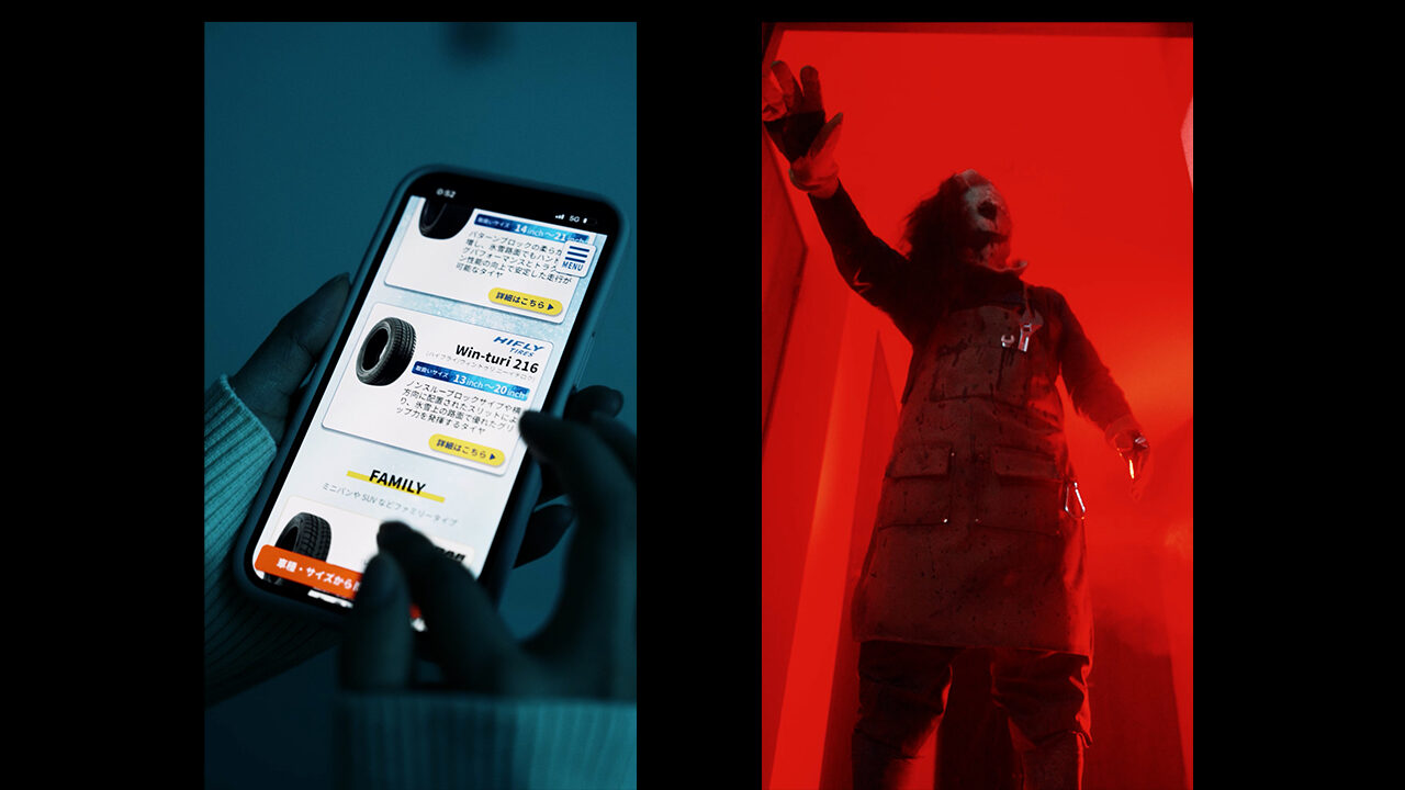 オートウェイの強みである「高品質タイヤを、プライスリーダーと呼べる価格でオンライン注文できる」点を知り、輸入タイヤに対する常識が覆った驚きを企画にしました。タイヤが必要な状況にある人物のもとへ、“頼れる存在”のようにタイヤが届くという比喩で、価値を直感的に伝えています。アメリカンホラー風の演出で「タイヤがやって来る」という誇張表現もユーモアとして受け入れられやすくし、「必要なときにすぐに手に入る安心感」を印象付けることを狙いました。