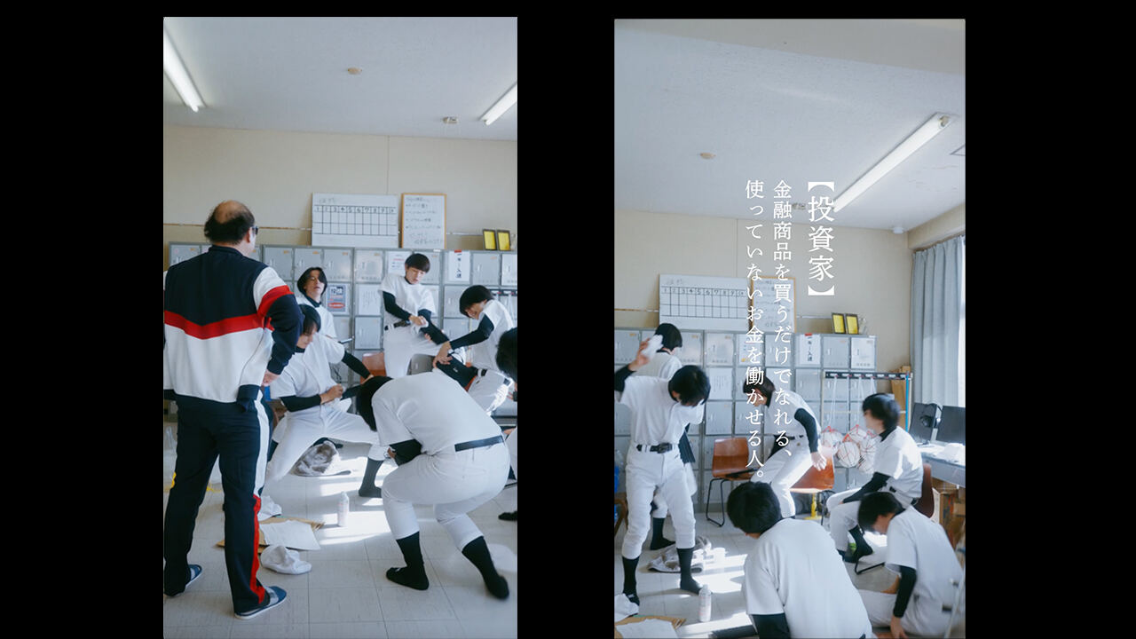 熱血顧問の指導の下、泣きたくなるほど間違っている「投資」の習得に全力で邁進する「男子投資部」。一生懸命間違って努力する姿を通して、始めたてこそ正しいところで投資しよう、というメッセージを伝えます。こだわったのは縦型コンテンツ然としていること。ただ、本物の「青春」には絶対にかなわないので、日常では起こり得ない「青春」の設定や展開をつくることで、「マジで存在しない記憶」として、落としのメッセージまで見続けさせることにチャレンジしました。